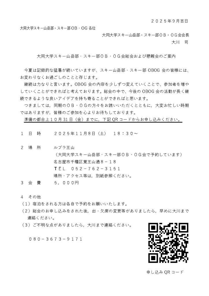 【スキー山岳部・スキー部OBOG会】総会・懇親会のご案内