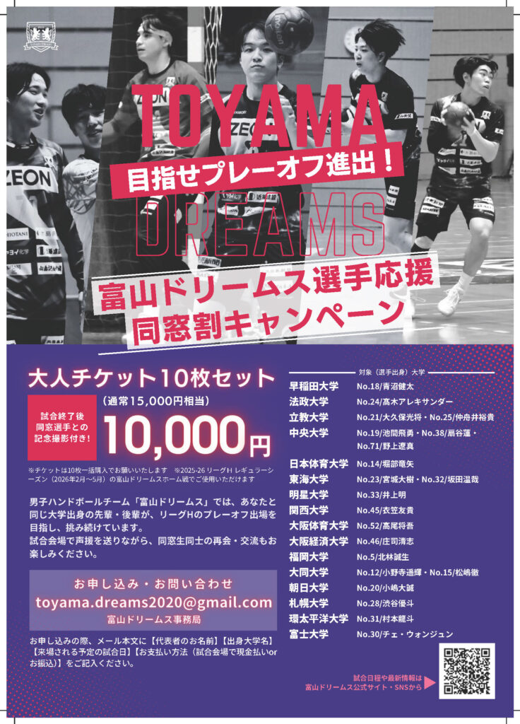 【富山支部】富山ドリームス選手応援同窓割キャンペーンについて 2026年1月28日daidouser10 お知らせ, 富山支部 富山支部より,ハンドボールリーグHで活躍する同窓生の情報共有がありました。 富山ドリームスのホームゲームチケットは同窓生割引があるそうなのでこの機会にぜひご観戦ください。 詳しくは添付のポスターをご確認ください。 daidouser10 Sidebar