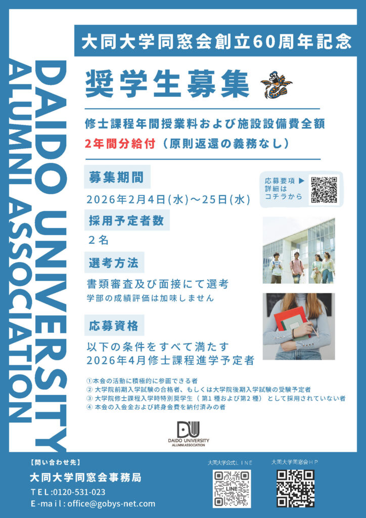大同大学同窓会では創立60周年記念事業の一環として、大学院修士課程進学予定者を対象として奨学生を募集します。